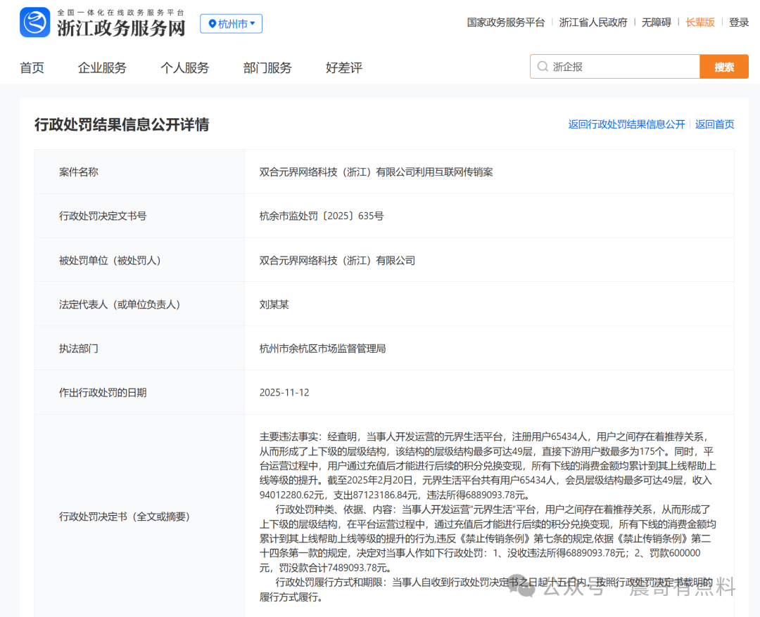 双合元界涉嫌传销,被杭州市余杭区市监局罚款7000多万,远离传销