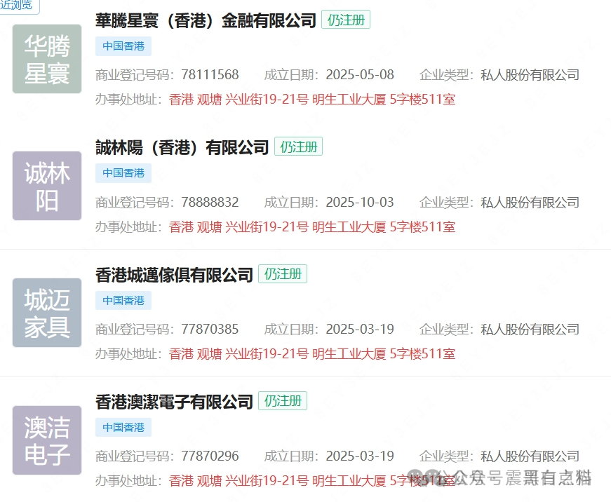它在香港共享办公室注册,同一地址注册过两千多家公司。国内关联的公司不是已注销就是经营异常,注册资金都是零。