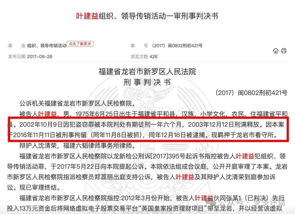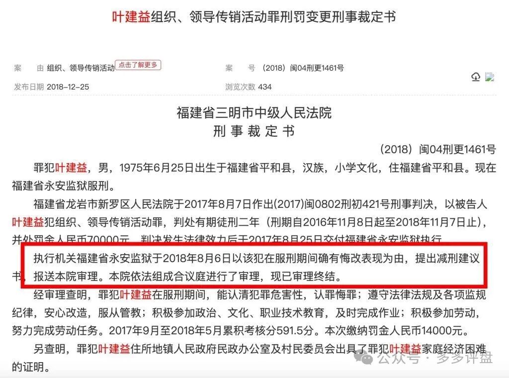 叶建益在此次案发前,早已是传销犯罪的“熟人”。根据公开的裁判文书,这位1975年出生、仅有小学文化的嫌疑人前科累累:早在2002年就因盗窃罪入狱;出狱后,又在2016年因组织、领导传销活动罪被判处有期徒刑二年,该案涉案60余人、金额高达130余万。此外,在2018年,他还因在服刑期间“确有悔改表现”而获得减刑两个月。