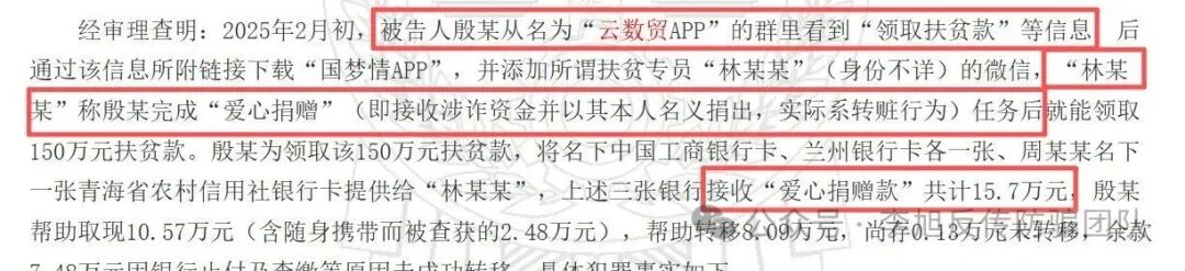 2025年2月,57岁的殷某在名为“云数贸APP”的群内看到“领取扶贫款”信息,随后通过链接下载了“国梦情APP”,并添加所谓“扶贫专员”林某某(疑似境外诈骗人员)的微信。对方声称,只要完成“爱心捐赠”任务(实为接收涉诈资金并转出),即可领取150万元扶贫款。