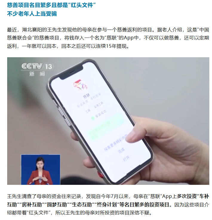 不法分子冒充“中国慈善联合会”的名义,打着慈善的旗号,虚构理财项目实施诈骗。去年就无法提现,近期网友反馈,该项目通过各种聊天软件又开始进行洗脑。