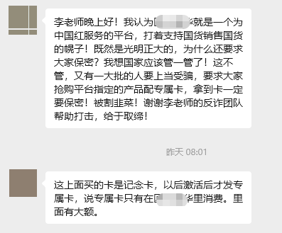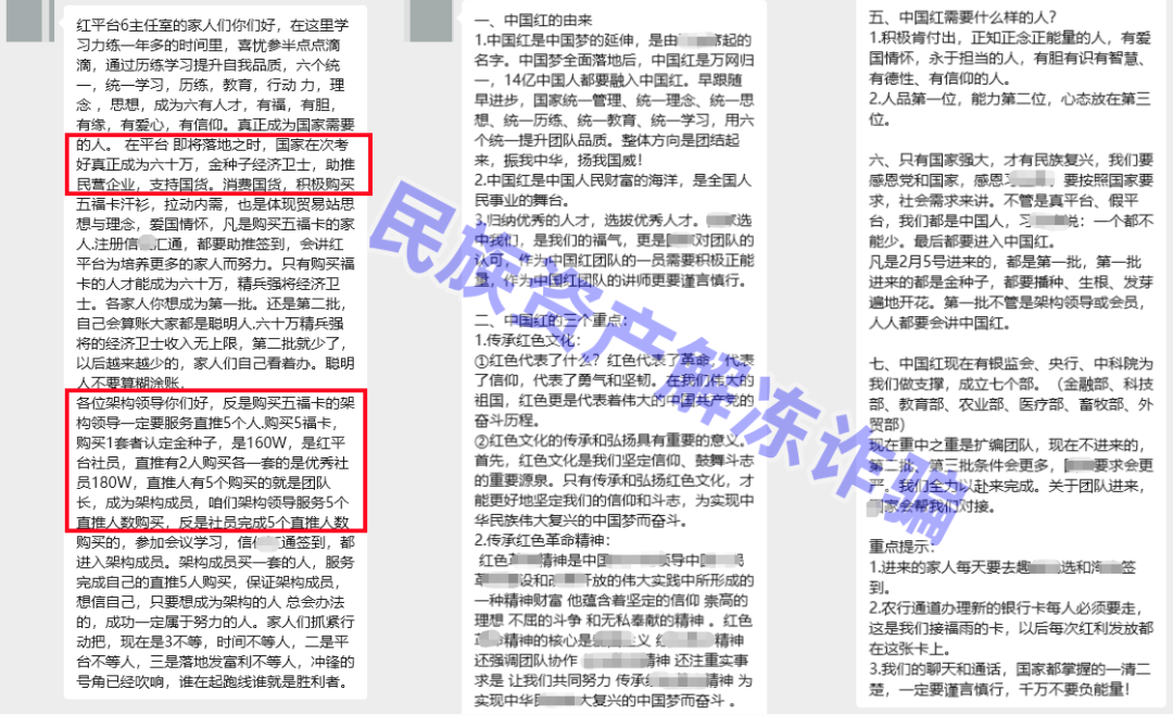 近日,网友反馈,一个名为“中国红”的平台,宣称项目要落地,参与者每天签到学习、在某电商平台购买“民族”产品(年前让参与者购买“五福卡”、)。