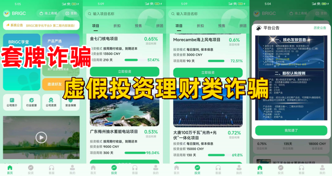 不法分子冒充香港“绿色发展”公司的名义,打着“一带一路”“绿色发展”“绿色低碳转型”等旗号,制作散布涉诈APP,虚构推广“海上风电项目”“光热+光伏一体化”“金七门核电”“抽水蓄能电站”等高额返利理财项目。