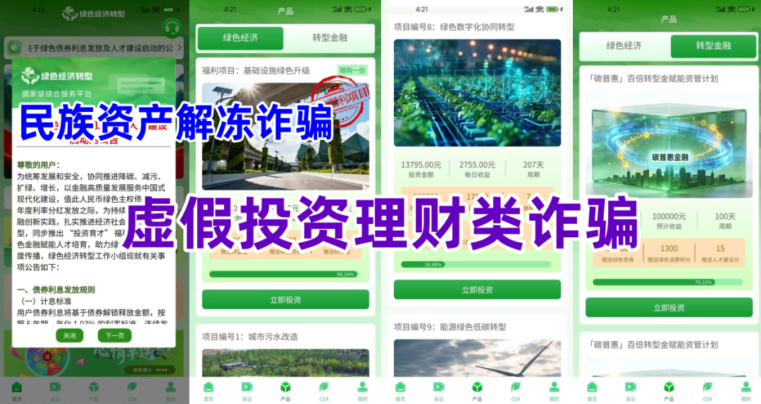 不法分子冒充“发改委”等六部委的名义,打着“绿色低碳”“数字化转型”等旗号,制作散布涉诈APP,发行绿色低碳消费积分,虚构推广“基础设施绿色升级”“城市污水改造”“清洁能源技术升级”“节能降碳绿色发展”“新能源发电工程”等高额返利理财项目。