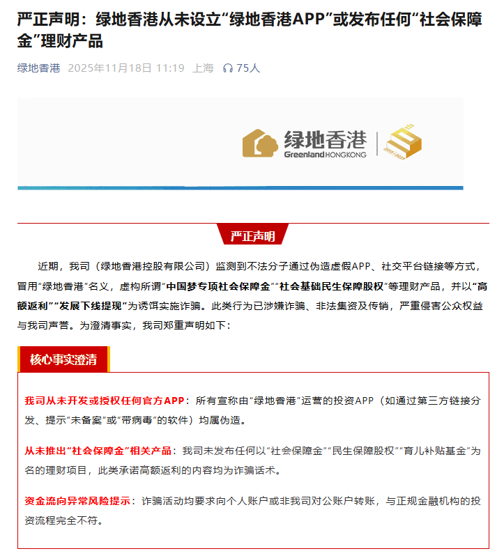 去年绿地香港公司多次发布声明,提示广大网友,绿地香港从未设立“绿地香港APP”或发布任何“社会保障金”理财产品。