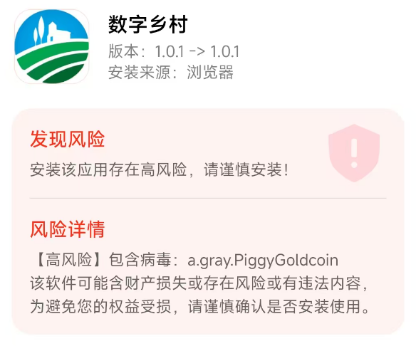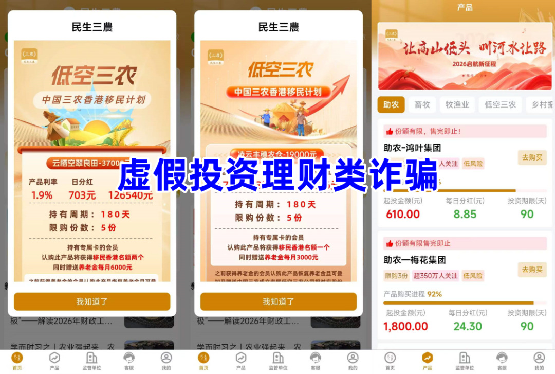 不法分子冒充“农业农村部”的旗号,制作散布涉诈APP,虚构推广“助农”“畜牧”“牧鱼业”“低空三农”“乡村振兴”等高额返利理财项目。