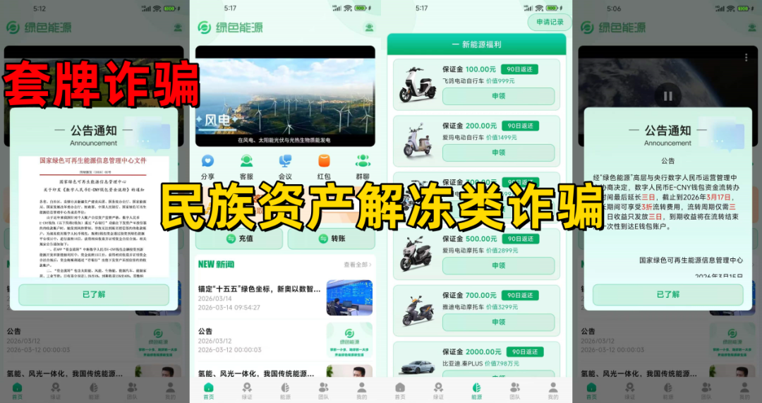 不法分子冒充“国家可再生能源信息管理中心”的旗号,打着“绿色能源”“低碳发展”等旗号,制作散布涉诈APP,实名注册登记资料,即可领取115万绿证,虚构推广“新能源福利”“新能源开发”“新能源利用”等高额返利理财项目。