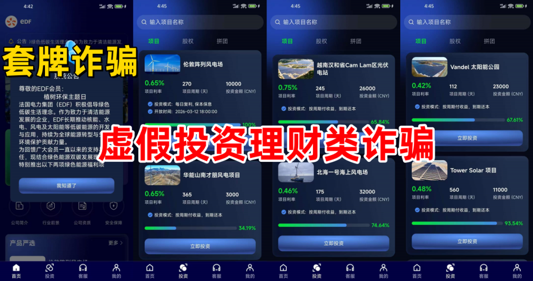 不法分子冒充法国电力公司的名义,打着“清洁能源”的旗号,制作散布涉诈APP,虚构推广“伦敦阵列风电场”“还能山南才朋风电”“Tower Solar”“北海一号海上风电场”等日收率0.4%以上高额返利理财项目。