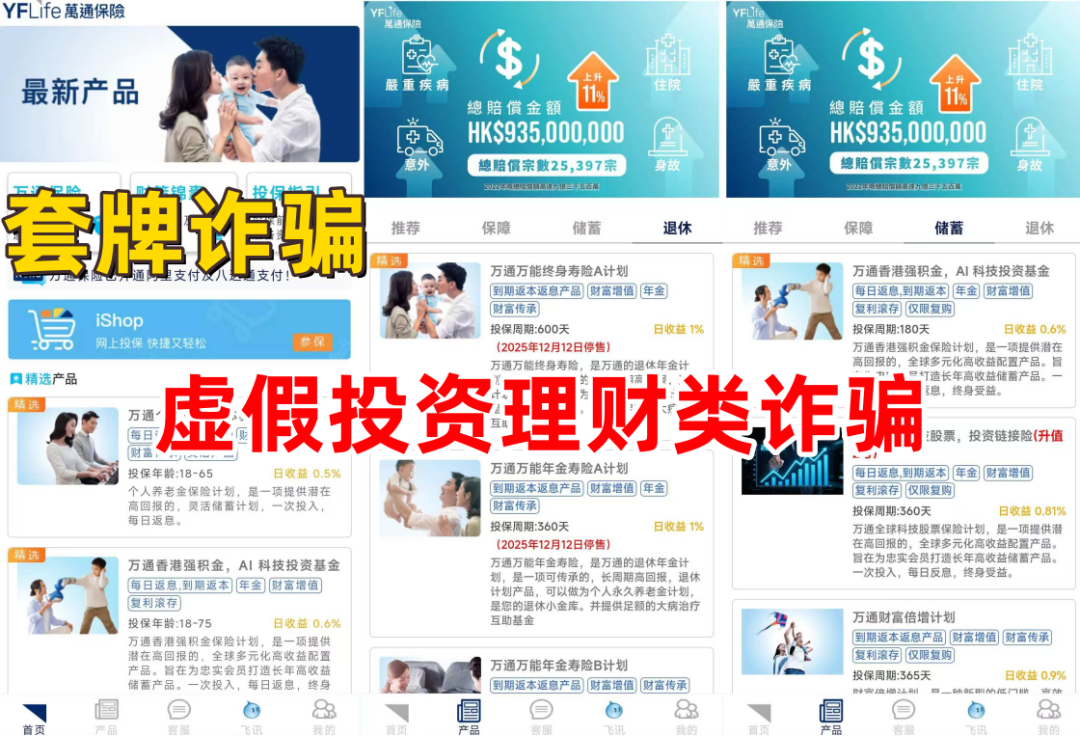 不法分子冒充香港“某”保险公司的名义,打着“养老理财”的旗号,制作散布涉诈APP,虚构推广“万通个人养老金”“AI科技投资基金”“终身寿险”等到期返本返息高额理财产品。