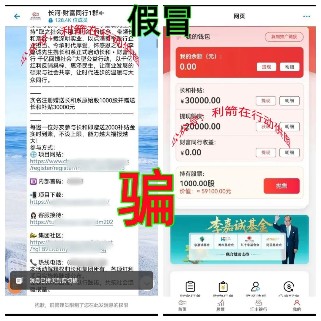 这几天网络中出现了假冒香港李嘉诚的“长江.何记”APP,该项目宣传“实名认证注册就送1000股长和系原始股和3万元补贴............”,这是一眼假的骗局,但是很多人却在提交身份信息注册。