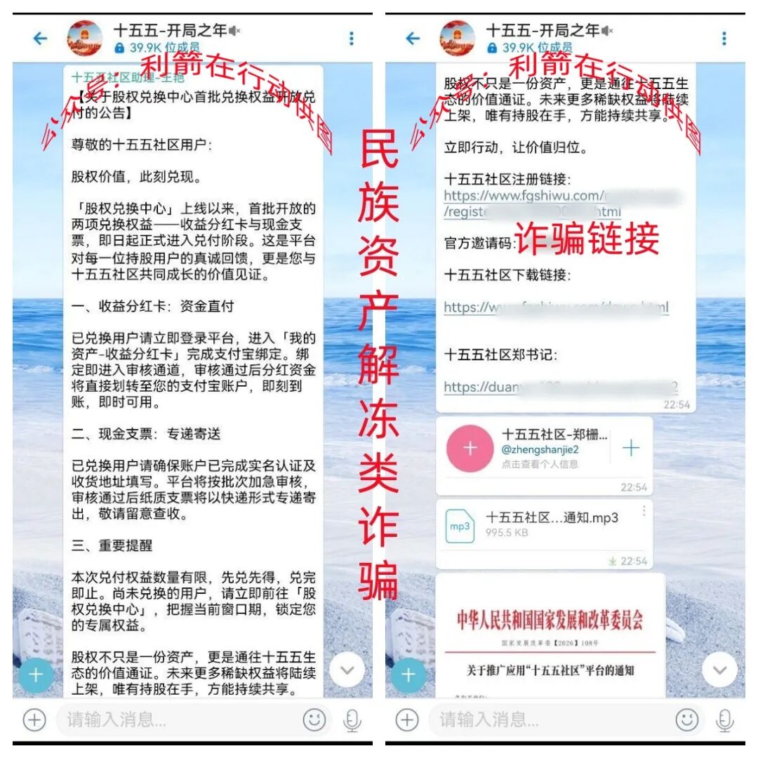 提醒:“十五五红利”APP是打着“国家项目”旗号的民族资产解冻类诈骗项目。