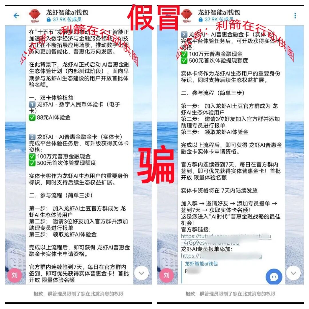 这几天网络中出现了假冒的龙虾智能AI项目,该项目宣传“在群内连续签到7天,每日在官方群内签到,即可优先获得100万元额度的实体普惠金卡,可提现500元...........”,想拿到这个项目的给的好处,就要联系群里面的“龙虾AI专员”“报单”?