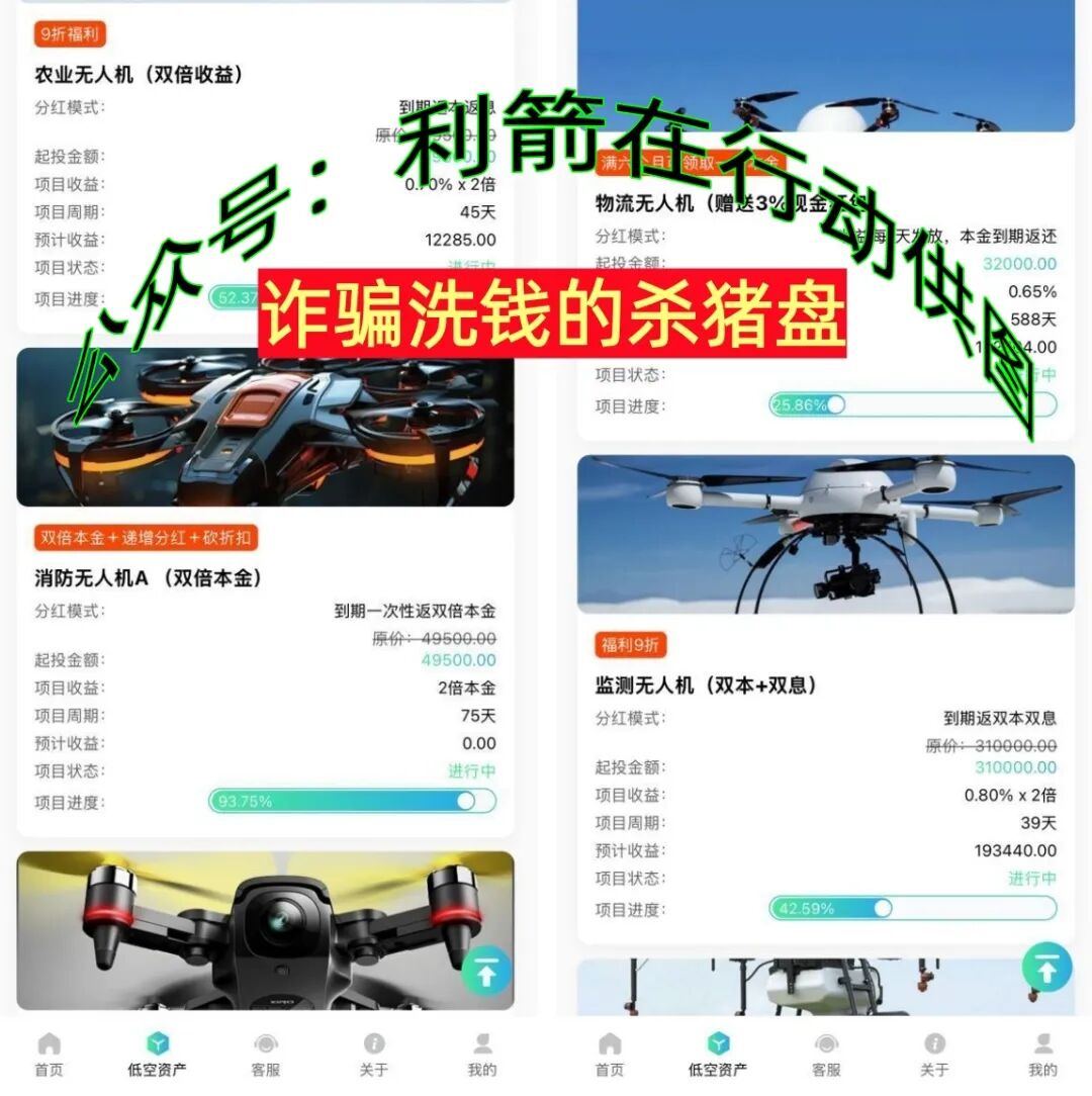 网络中出现了“LAE”APP,该项目中宣传是“低空经济无人机”,让人交钱“投资”,随着交钱金额的加大,收益越来越高,时间越拉越长,最低几十天,最高达到了588天的“周期”,通过收款账户上看出,全是来路不明的账号收款,因此这是涉嫌诈骗洗钱的杀猪盘。