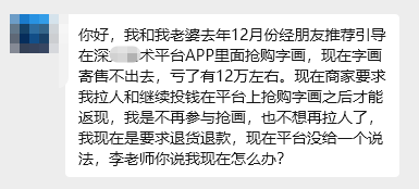 近日有网友反馈,自己去年12月经朋友推荐参与该项目,如今手中的字画完全寄售不出去,短短几个月就亏损12万元,平台商家还要求必须拉人入伙或继续投钱抢购字画,才能办理提现。