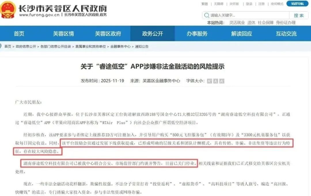 先有长沙市芙蓉区人民政府官方网站发布《关于“睿途低空”APP涉嫌非法金融活动的风险提示》(该项目方立刻更名卷土重来),后市面上又出现了“LAE低空经济”App、“环某低空”App等同类骗局,大家务必警惕。