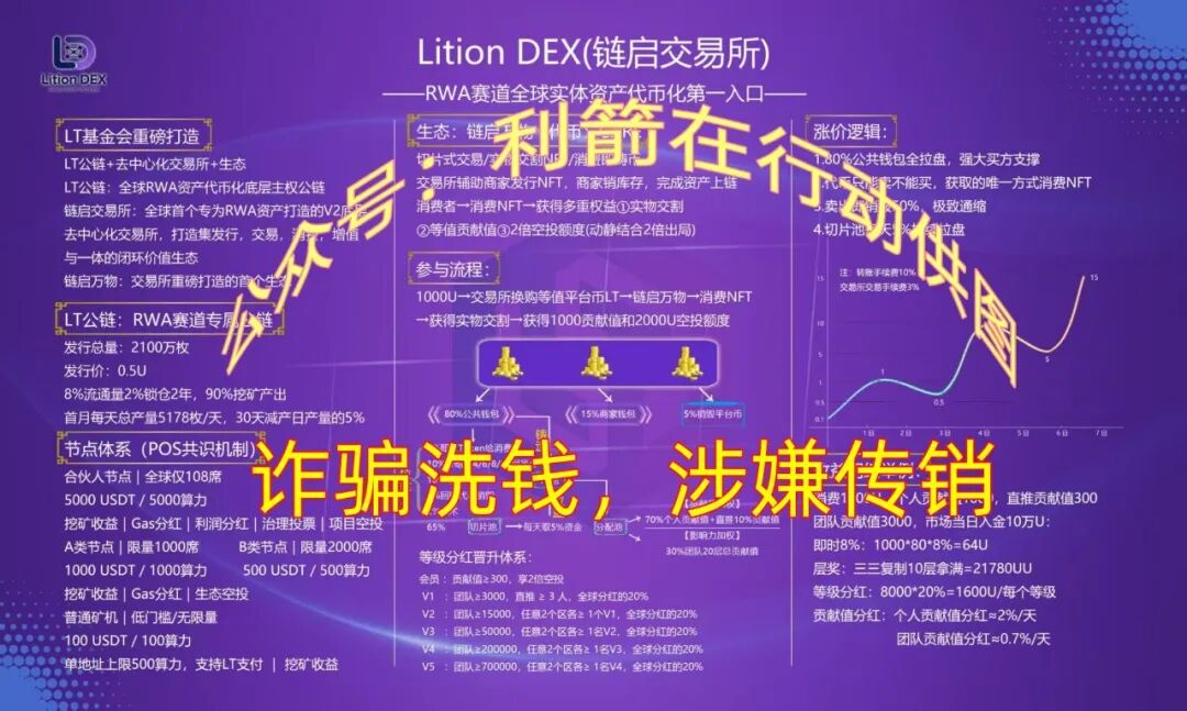 宣传是“LT基金会”打造的LT公链(链启交易所)是全球RWA资产代币化底层主权公链..........该项目进场1000U到平台换成代币LT进行炒作,涉嫌诈骗洗钱。V1到V5,每个层级都有相应的人数规定,达到层级获得相应的奖励,因此LT公链是涉嫌传销诈骗洗钱的资金盘。