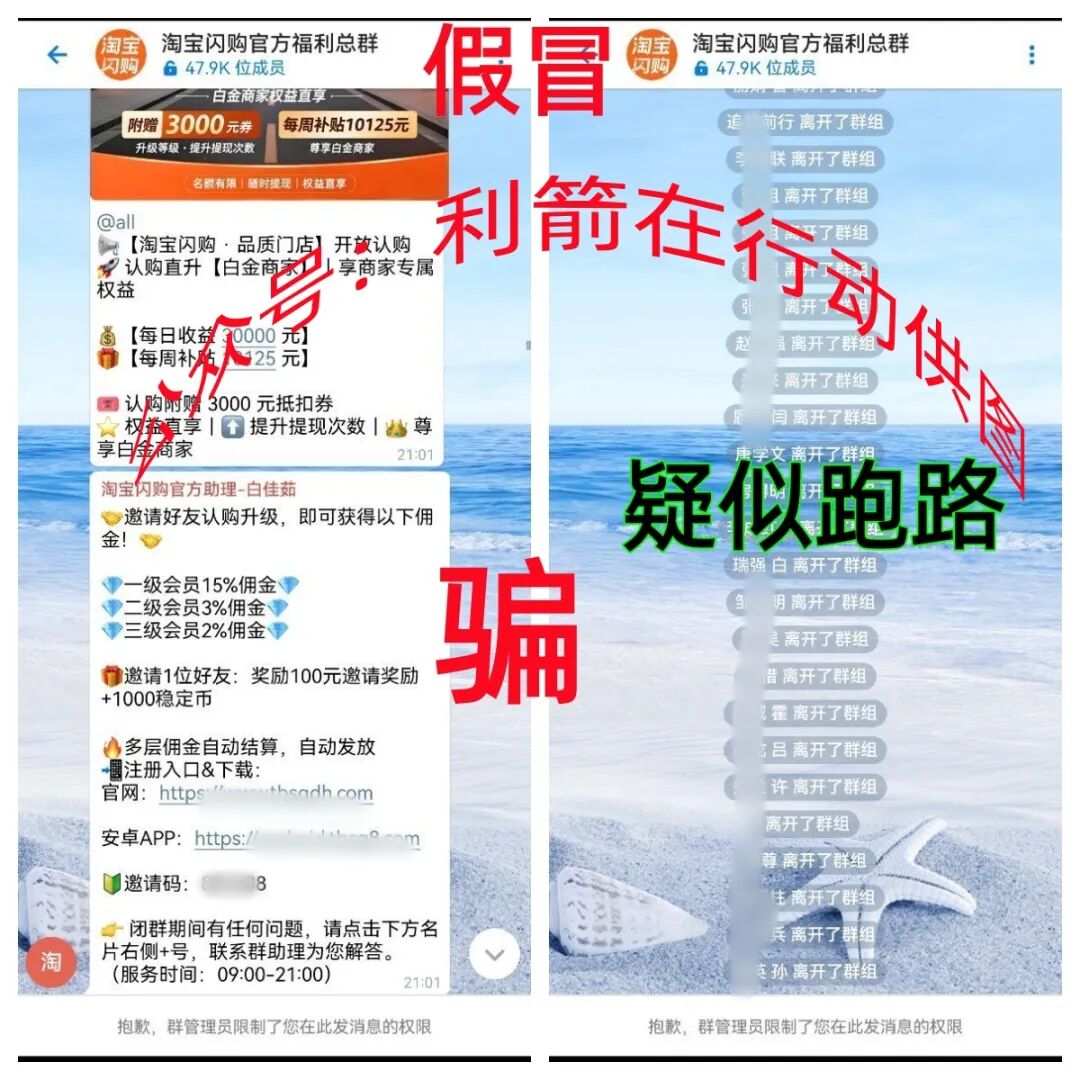 假冒淘宝的“淘宝闪购”APP采用三级分销,骗取参与者身份信息,骗取钱财,近期清空了群里面所有的信息,APP打不开了,疑似跑路。