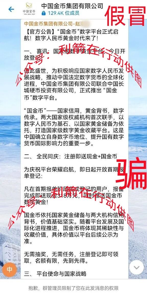这几天网络中出现了假冒中国金币集团有限公司的“国金币”项目,该项目谎称是“国家项目”,完成报单就送318万元,还要赠送“国金币”数字黄金,这是用虚假的高额回报,骗取参与者身份信息进行精准诈骗的民族资产解冻类诈骗项目。