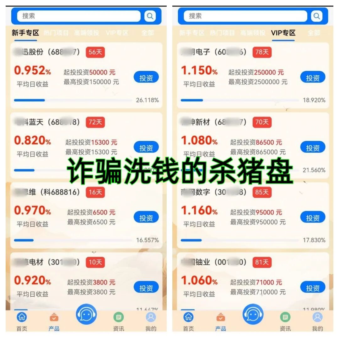 进入假冒的“黑石集团”APP中,看到了“新手专区”、“热门项目”、“高端领投”、“VIP专区”共4个项目,从新手项目中有最低交钱860元,投资3天,日收益0.96%,“VIP专区”最高交钱105000元,日收益1.2%,投资周期90天看出,这是让人越陷越深的杀猪盘。