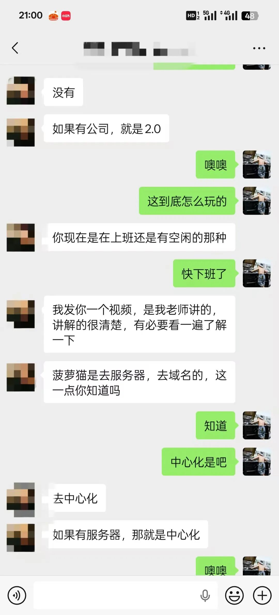 首先我们从他们的推广员宣传项目的介绍出发,第一位我就聊了这么多,不想听她扯淡了,一句“菠萝猫是去服务器,去域名的是去中心化”把我逗笑了,这简直是把哥们当棒槌在逗啊!