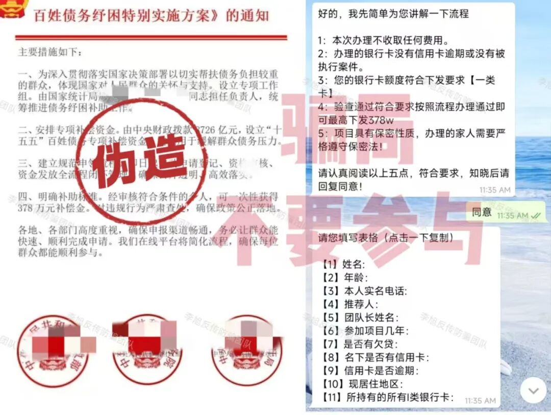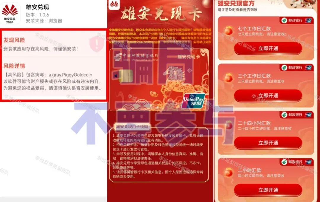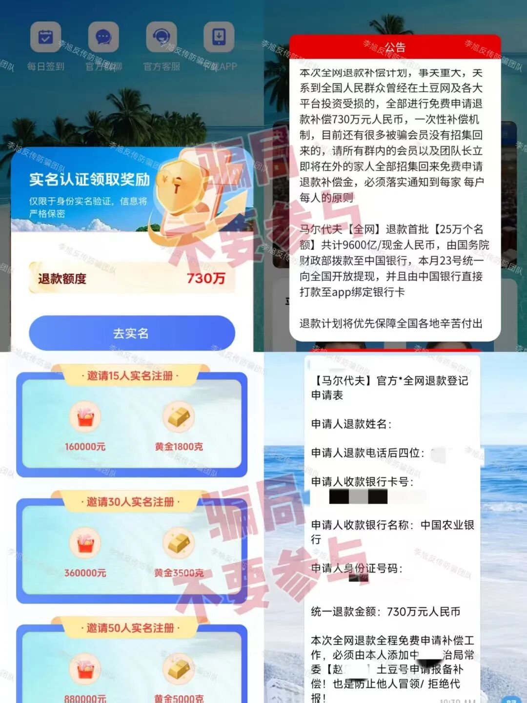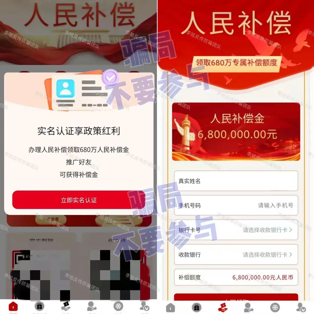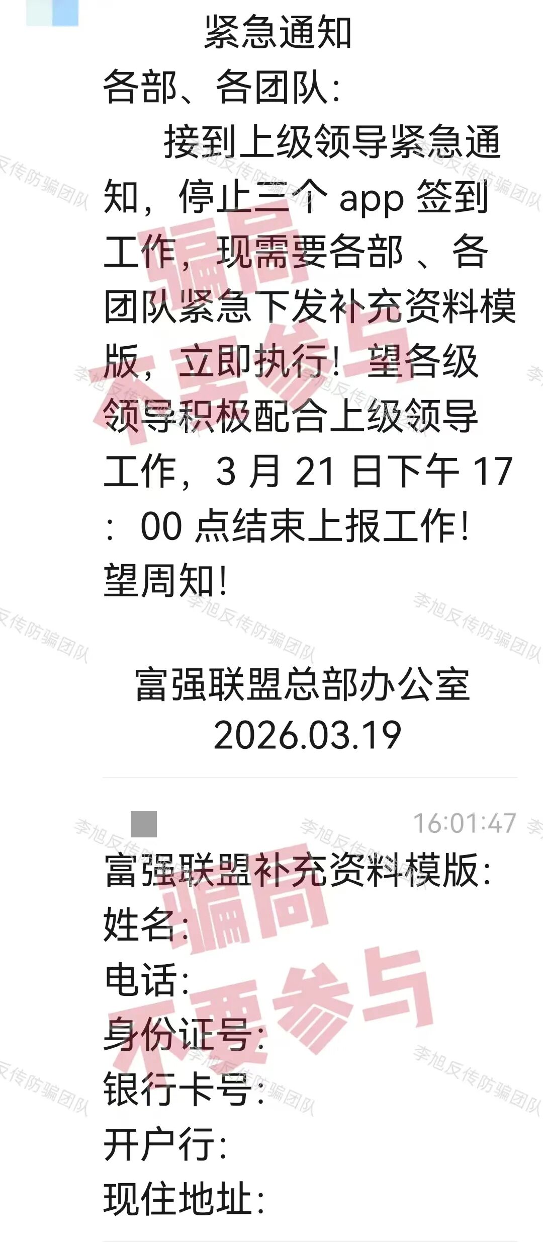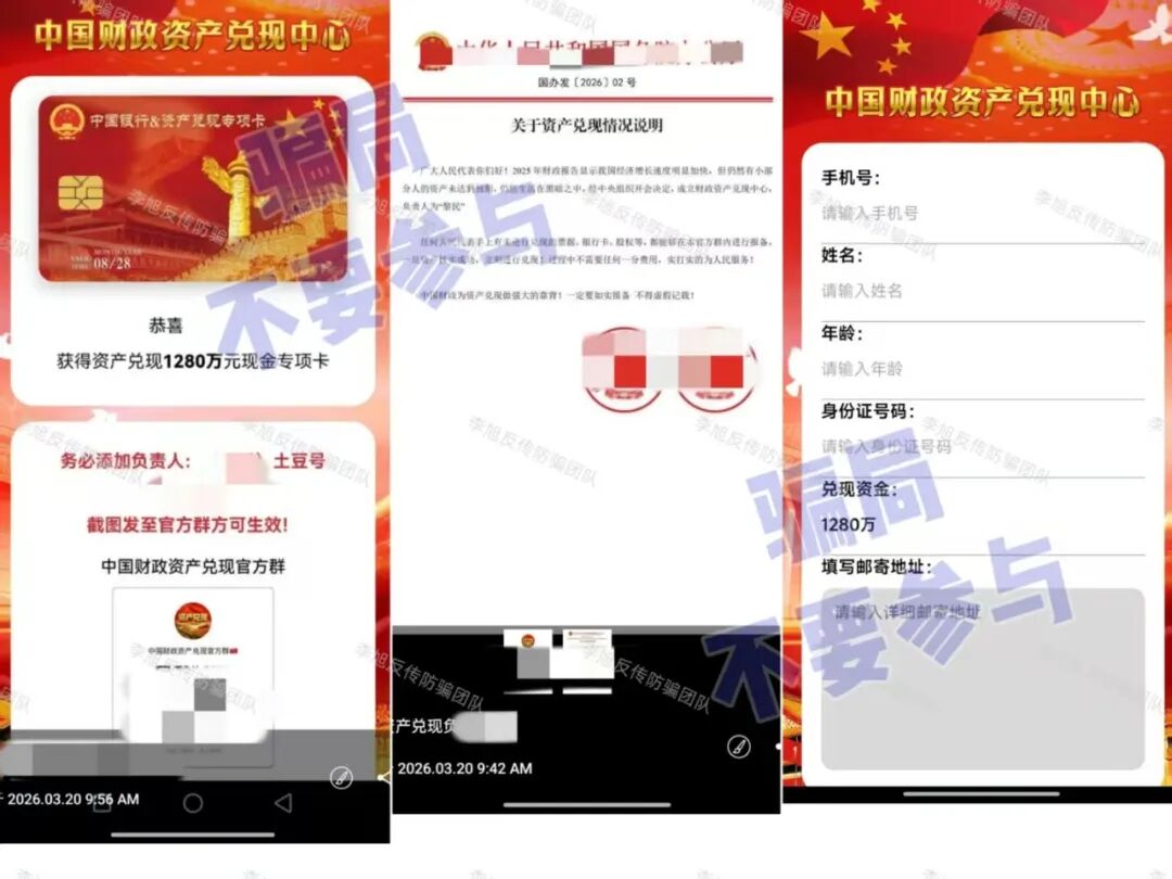 这个项目,大家应该都不陌生。 在反复向参与者收取保证金、席位费、税务登记费、反洗钱费等多个费用后,平台依旧没有兑现,开始了所谓的“升级更新”。 但很快,“助理”在群内几句话就给出了这个剧本的最终“结局”。 “项目被立案调查,所有人进入无限期等待……” 至此,一个骗局完成了全部流程,收割完毕落幕。 回顾整个过程,从去年7月的假借名头造势,利用上市等高额回报扩建团队,推出理财产品敛财,借提现多次收费,无限期拖延甩锅,编故事软跑路…… 简直是教科书式的诈骗流程。一旦平台开始以各种名义让大家交钱才能提现,那就是它准备卷钱走人的信号! “实名注册领取1000万资产”……听着就很不靠谱,但就是这样一个显而易见的“陷阱”,依旧吸引了一大波参与者。 更搞笑的是,一个号称“官方”发钱的项目,用户甚至还能通过交钱的方式选择到账时间。可收款方却是不停变换的个人账户。 最近,项目方又找到了新的收费名头,以升级卡片的名义要求参与者缴纳768元升级费,而这已经是第五次交费了。 其实,这个APP下载时就已经提示存在高风险,IP地址是一家私人公司,种种迹象都可以证明这就是一个诈骗项目。 但是,和“人脉联盟”APP一样,尽管平台次次失信,只要还有人愿意相信,类似的收费名目很可能还会继续出现。 前事不忘后事之师,请参与这个项目的人尽快远离,及时止损! 自“云数贸张健”落网后,打着其名头出现的虚假项目层出不穷。其中“马尔代夫”系列项目更是一个接一个。 一部分是打着“马尔代夫”名义出现的所谓的重启盘,一部分是假借为参与“马尔代夫”项目人群退赔的补偿盘。 这些项目包括但不限于“马尔代夫”、“马尔代夫3.0”、“马尔代夫兑现版”、“马尔代夫交易所”、“马尔代夫退款”等多个。 最近这个新APP,号称为参与者退赔730万。但是,这其实就是个非法收集个人信息的壳子。大家填的每一个字,都可能被倒卖,甚至被用来洗钱。 谎称与财政部合作,要为多年参与项目遭受损失的“难民”无条件发放一张内含300万余额的万事达卡。在添加所谓的“负责人”后,对方开始以“申请表”的名义向用户索要身份证号码、正反面照片、手机号、主食、工作类型等详细的个人身份信息。 仅凭一个虚无缥缈的承诺,就轻松套取大量用户个人信息。这些信息很可能被倒卖,或者成为涉诈项目转移资金的工具。保护个人信息,就是保护自己的财产安全。 冒充公职人员,打着“国家”名义,声称只要实名注册填写登记表,就能免费获得一张内含1280万的“资产兑现专项卡”。 这里要明确一个专业知识:任何具有支付功能的合法银行卡或凭证,都必须由持牌金融机构依法发行,并纳入国家金融监管体系。 这种假卡片实际根本没有任何价值,也无法取现。待平台觉得时机成熟,这张卡片就成了骗子一次次将手伸进参与者的口袋里掏钱的工具。 利用伪造的政策文件,打着补偿“圆梦行动”项目损失的名义,声称实名注册就能获得680万补偿金。 和上面提到的项目类似,同样也是需要用户提交身份证、银行卡号等相关信息,号称邀请新人还有额外奖励。 但是,APP只能通过链接复制至浏览器下载,安装时提示未通过备案,存在高风险且携带病毒,IP地址更显示在境外。 这些看似高额的“补偿金”发放也并非真是到账,全部显示在软件账户中。后续,平台就会利用这组数字,假借提现向大家收费。 蹭“十五五”政策热点,冒充公职人员,以“债务补偿”的名义向参与者索要银行卡、身份证等个人信息,声称可获得378万补偿。在平台发出的调查表格中,详细询问参与者是否有欠债、逾期,甚至统计用户名下所有I类银行卡。 此举的目的,很可能是不法分子在寻找信用记录尚可的“白户”,诱使其提供银行卡,用于为电信诈骗等犯罪活动“跑分”洗钱。一旦参与,不仅银行卡会被冻结,本人也可能涉嫌“帮信罪”等,从受害者变为犯罪工具人。 沉沉寂一段时间的“富强联盟”又开始活动,鼓动成员填写身份证、银行卡、住址等详细信息。 它和之前曝光的“终谷集团”、“民委”等扫码走通道类项目套路一致,都是通过冒充国家某部门,承诺发放“福雨”等回报,诱导参与者每天完成签到、扫码等任务,以此收集个人信息并维持热度。 精准抓住了中老年朋友对养老保障的关注,谎称注册就送“保障基金”,并通过划分签到等级来发放“津贴”,极具迷惑性。 但这些“收益”同样只是APP后台的一串虚拟数字。当大家想提现时,审核费、激活费、手续费 会接踵而至,直到榨干钱财。 任何以“签到领高额福利”为诱饵,最终都是指向“交费提现”的模式,千万别信。 3月13日,数字人民币运营管理中心官方微信发文,明确指出了目前在网络上假借“数字人民币”出现的三个常见套路。任何借着此名义声称可以获得高额回报的项目都是骗局,切莫相信! 遇到这些打着数字人民币旗号的“套路”,请直接说不