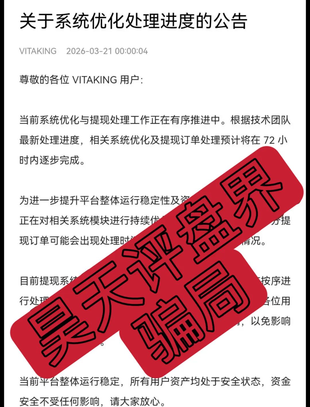 分红类资金盘骗局,3月21日平台发布公告:因为系统优化的原因,提现订单处理预计在72小时内逐步完成,很明显要崩盘跑路了,切勿被二次收割...
