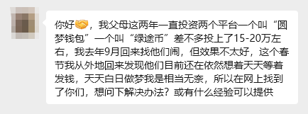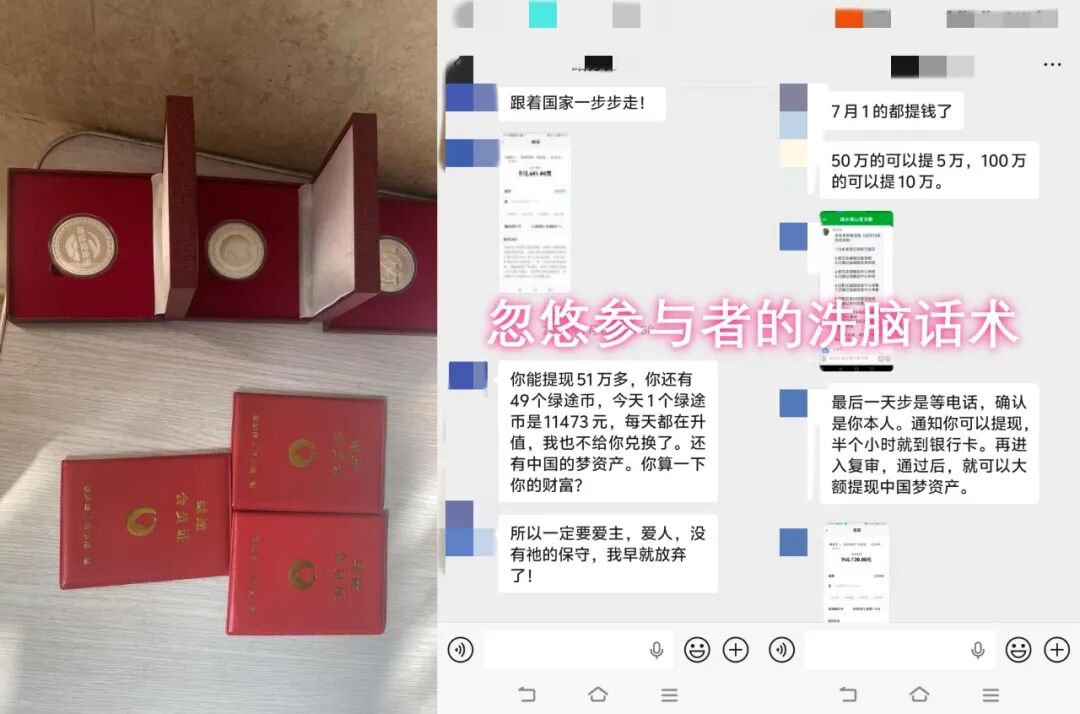 近期有网友反馈,其父母倾尽家中积蓄购买“绿途币”,如今只能靠信用卡维持生活,而平台从去年就宣传可提现的“中国梦资产”,至今分文未兑现,即便如此,仍有参与者深陷骗局无法自拔。