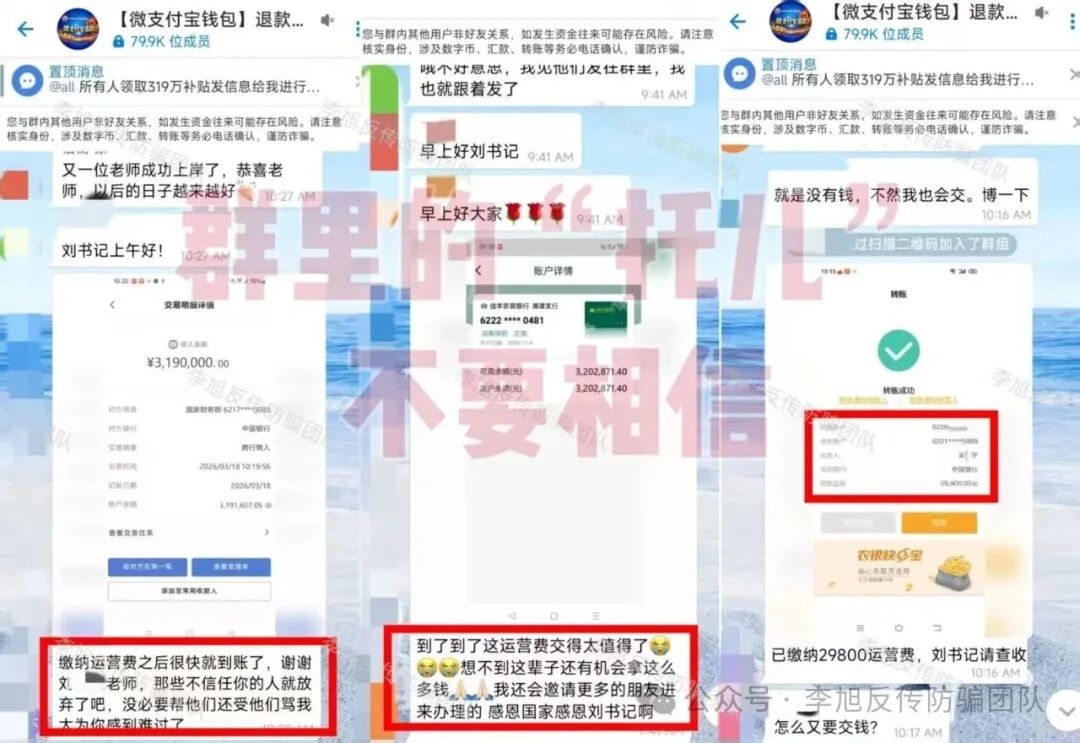 为消除群众质疑,诈骗群内雇佣大量“托儿”,发布伪造的到账截图,以此蛊惑更多人交钱。