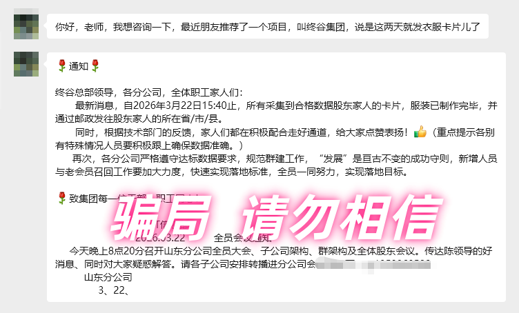 该诈骗主体多次更名,从“仁礼集团”改为“终谷集团”,近期又更名为“终谷农项”,但无论名称如何变更,其本质均为无任何备案资质的非法组织。