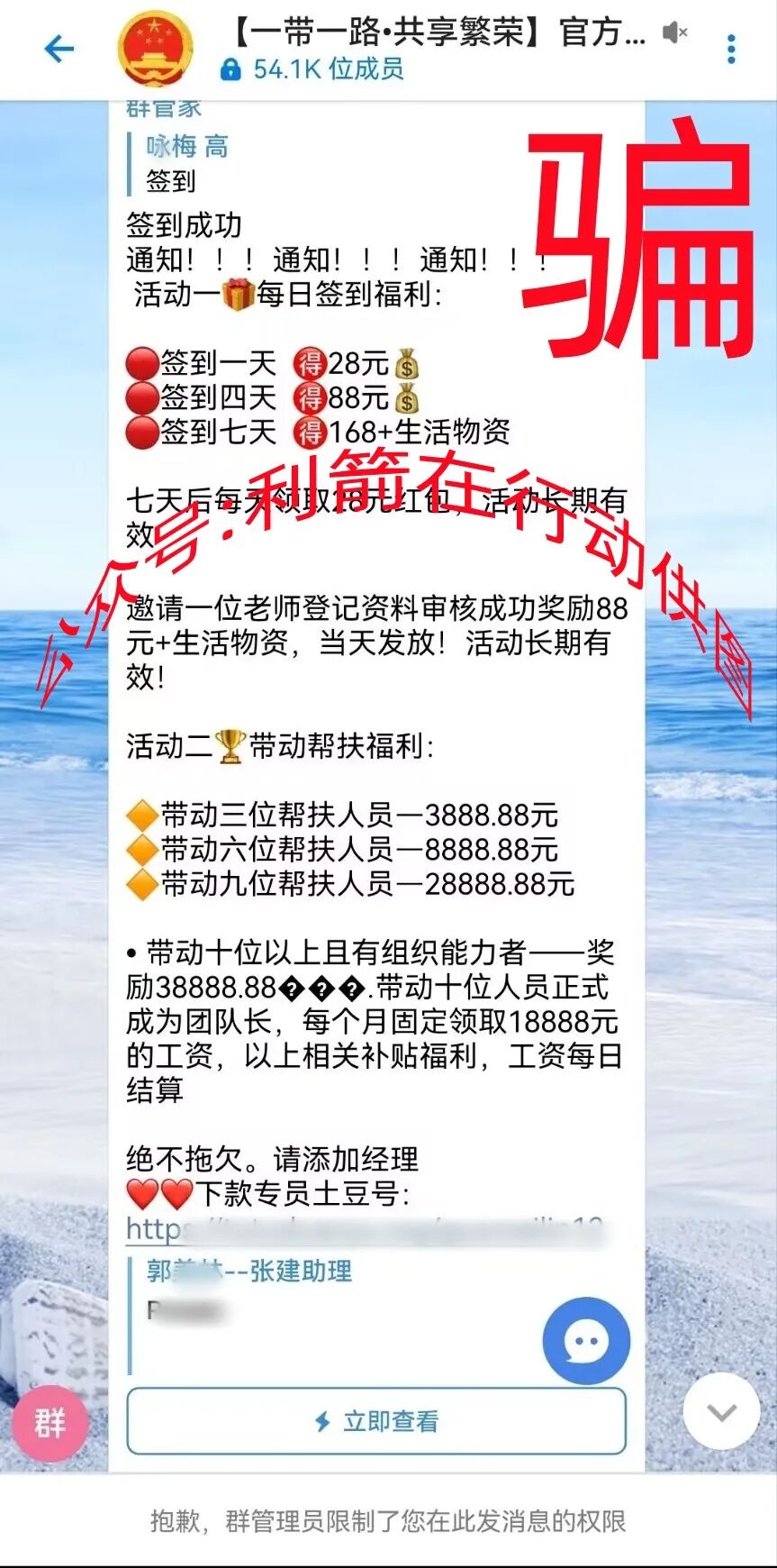 近期出现了“一带一路•共享繁荣”项目,该项目前期骗取参与者身份信息,后期让参与者交各种费用进行诈骗,请大家提高警惕,别中了骗子设计好的圈套。