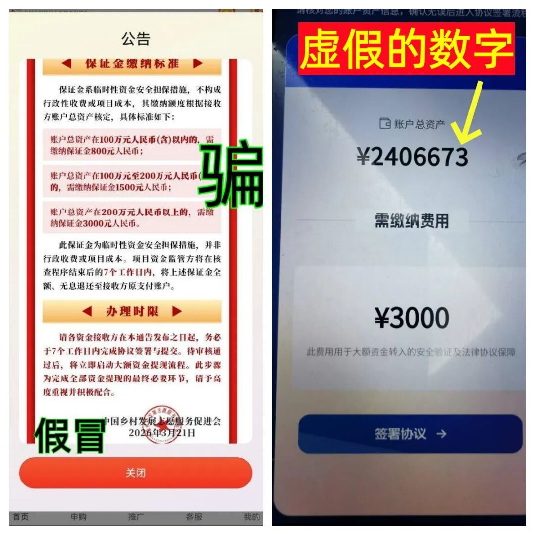 “乡村公益扶贫”APP中假冒中国乡村发展志愿服务促进会发的虚假公告:账户资产在100万元以内交800元,100万至200万交1500元,200万资产以上的交3000元???这不是明摆着骗钱么?既然账户上的钱都是你项目方给的,你直接扣除不就行了么?何必多此一举的让大家交钱?这也说明了平台方给的“扶贫资产”是虚假的数字而已。