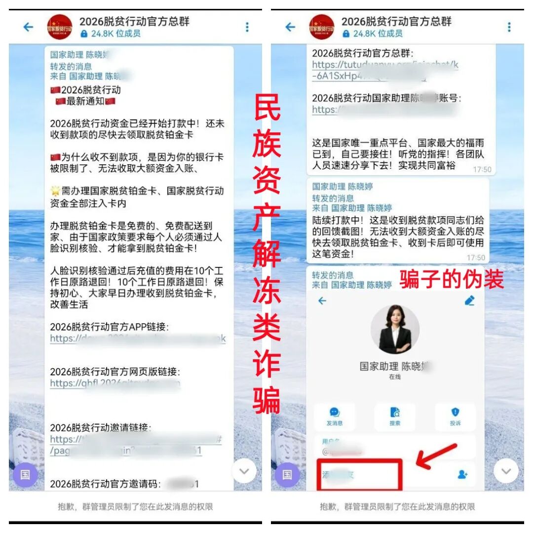 近日网络中出现了2026脱贫行动APP,该项目宣传“个注册的人发放500万元扶贫款,每天签到领取1万元..........”,这是一眼假的骗局,查到网站IP地址在美国,系非法网站,群里面的“国家助理”是骗子伪装的,扪心自问一下:我国哪有国家助理这个职务,这是编造出来的,目的是忽悠被骗人的!