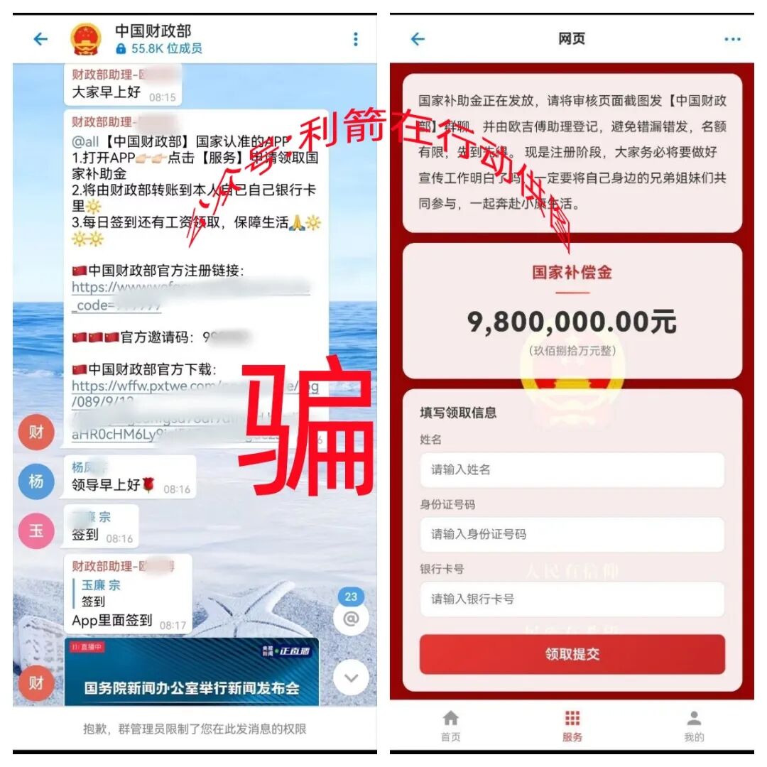 昨天网络中上线了假冒的“中国财政部”APP,该项目谎称要给注册的参与者发放980万元“国家补偿金”,前期用虚假的“高额回报”骗取参与者身份信息,后期会让被骗人交各种虚假的费用,这是民族资产解冻类诈骗项目。请大家提高警惕,别被骗了。