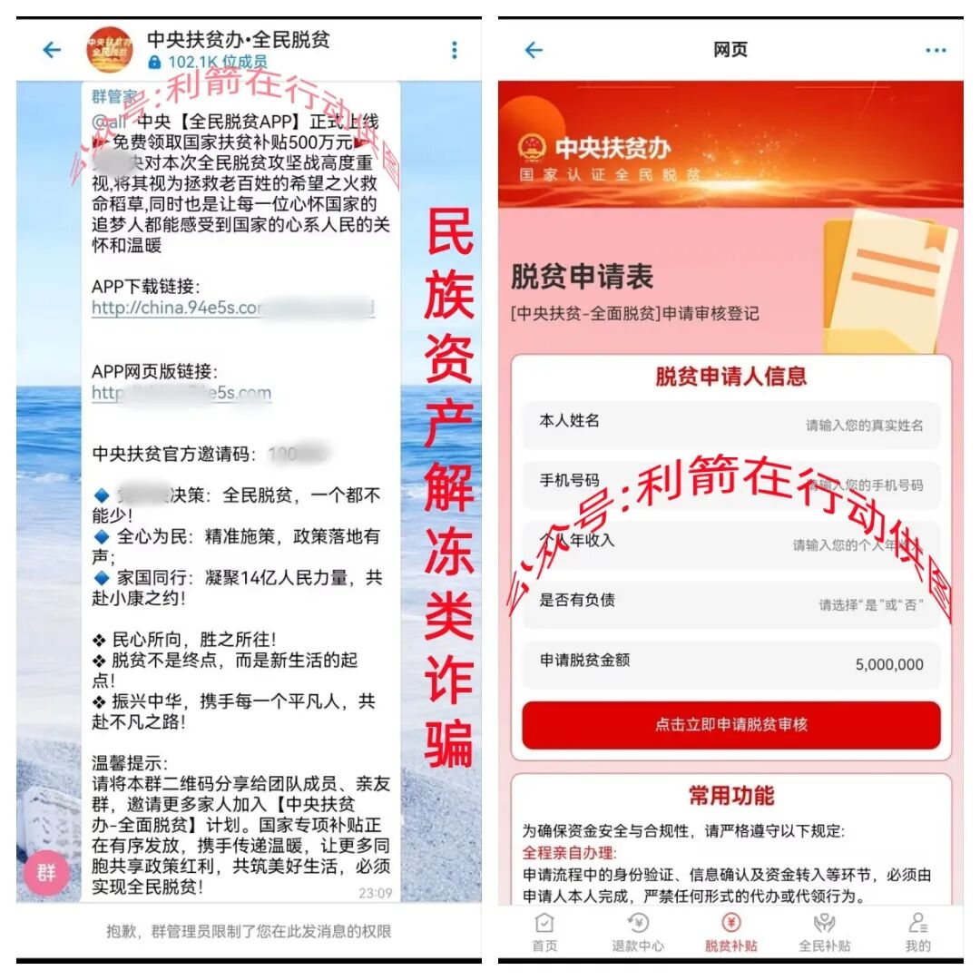 近期虚构的“中央扶贫办”APP上线了,该项目打着“国家项目”旗号,谎称要给注册参与者发放500万元“扶贫补贴”?每天签到还要领取5000元,这是一眼假的诈骗,查到该项目网站搭建在国内,系非法网站。以虚假高额回报做“诱饵”骗取参与者身份信息,后期提现的时候,就会被要求交各种虚假的费用,这是民族资产解冻类诈骗项目,请大家提高警惕!
