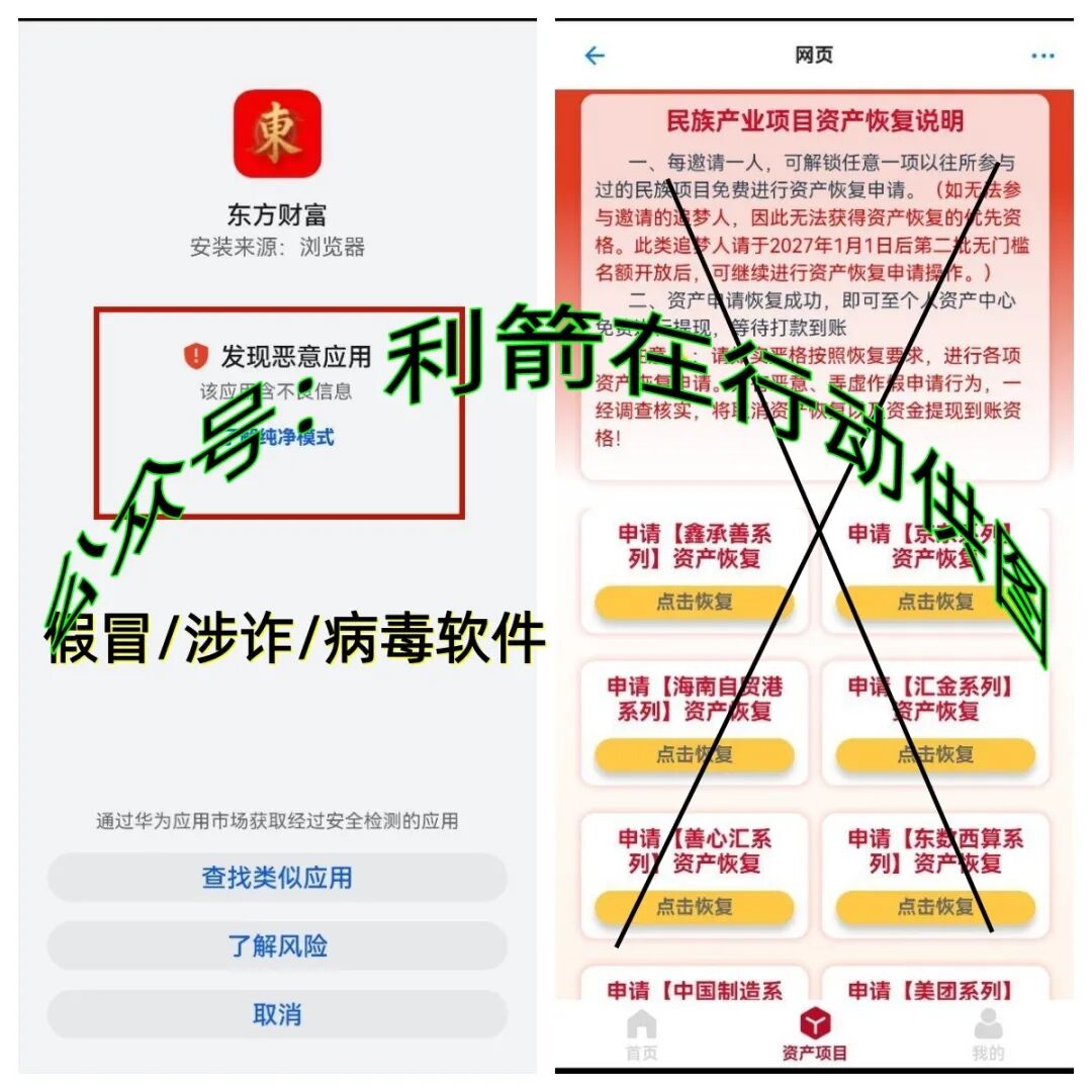 假冒的东方财富APP中谎称要给参与民族资产大业的人退赔资金?这是一眼假的诈骗项目,哪有白给你来退钱的,这种以“退款发钱”为噱头的平台,实际是骗取参与者身份信息,骗取钱财的民族资产解冻类诈骗项目。