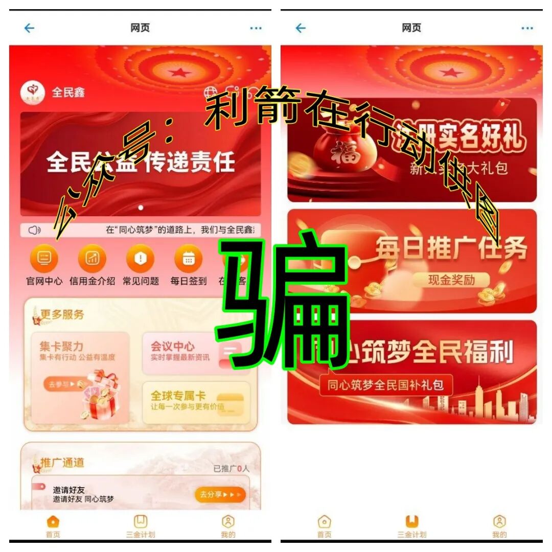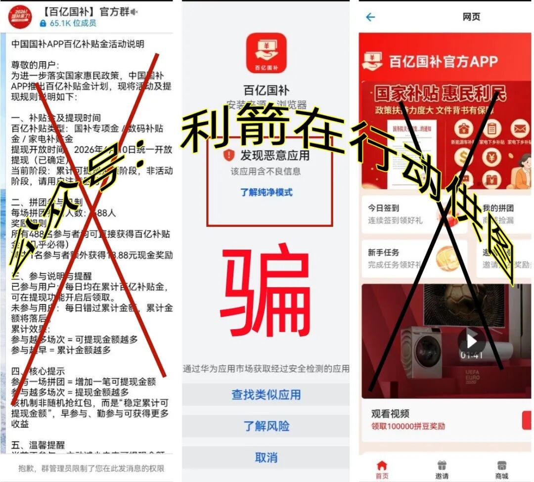 近期网络中出现了打着“国家项目”旗号的“百亿国补”APP,该项目宣传采用拼团模式,参与者可瓜分“百亿补贴金”?实际就是拉人头进入注册,谎称要邀请人许多“高额回报”,利箭小编查到该项目的网站搭建在境外,“百亿国补”APP是病毒软件,编造电话号码就能注册,说明是假的!