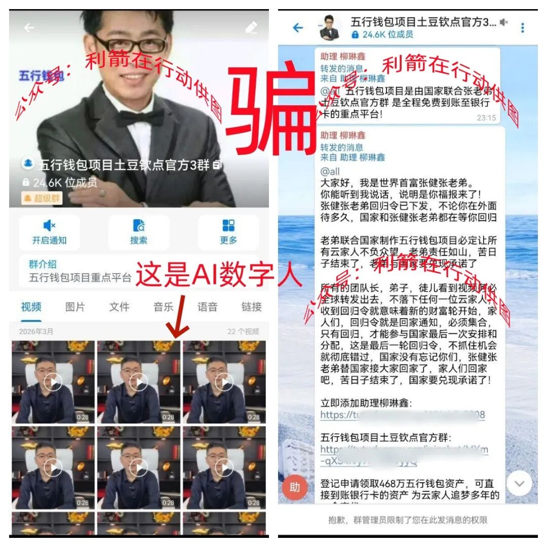 这段时间,网络中出现了骗子伪装的“云数贸张健”在视频中谎称“登记申请领取468万元五行钱包资产”,这是打着“国家项目”旗号的民族资产解冻类诈骗项目。