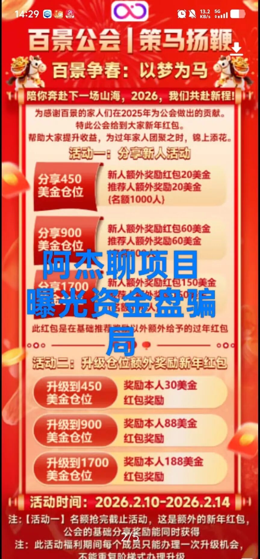 节日活动诱骗加金:2026年春节推出“分享新人红包”“升级仓位红包”“分享450美金仓位,新人+推荐人各拿20美金,升级仓位最高拿188美金红包,用额为福利诱导你拉新人,加仓位“把最后一波钱骗进来。