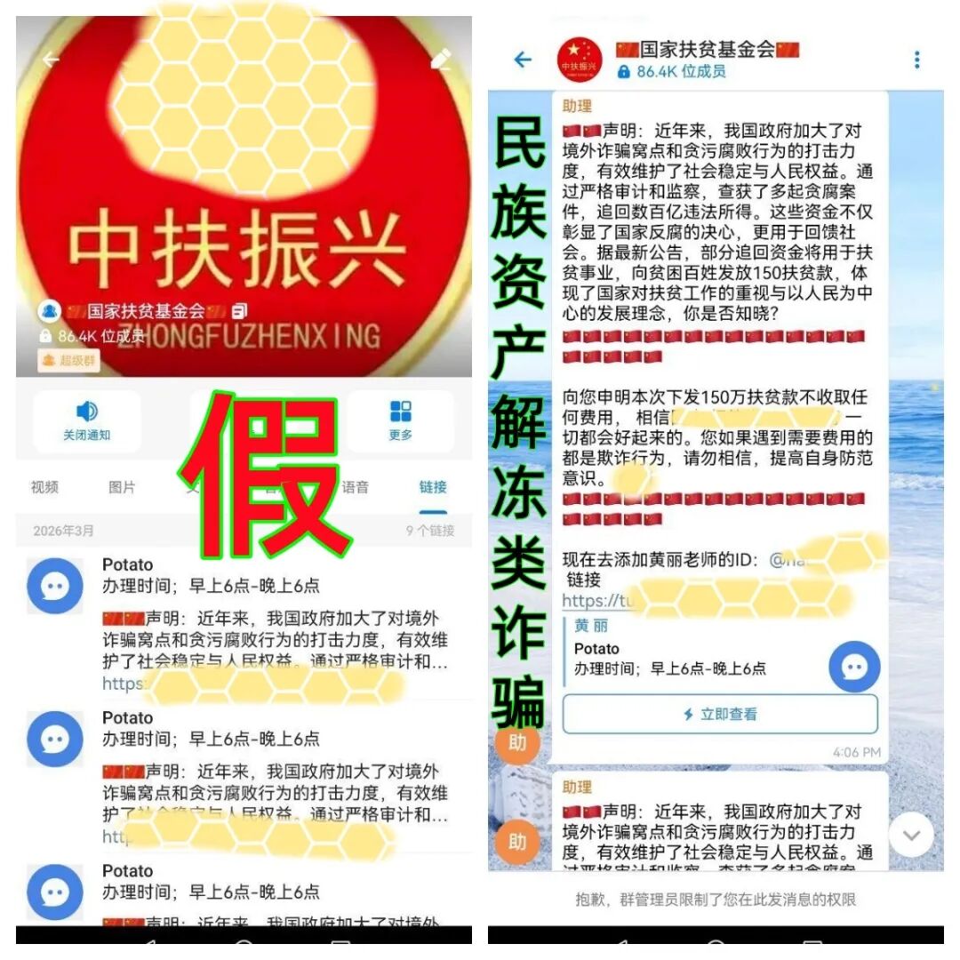 近期网络中出现了虚构的国家扶贫基金会,该项目宣传要给参与者发放150万元“扶贫款”,这是一眼假的骗局!我国没有“国家扶贫基金会”这家组织,也不会通过群里面发放上百万的“扶贫款”!这是民族资产解冻类诈骗,请大家不要上当被骗。