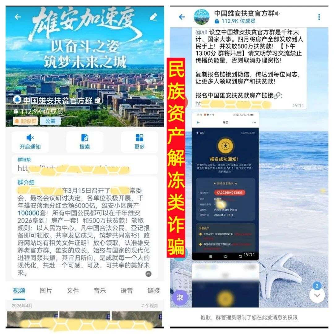 网络中出现了假冒官方,虚构的“雄安扶贫”,该项目宣传:提交身份信息就可以申请500万元“扶贫款”,还能获得一套雄安房产,这一眼假的骗局,不少人在群里面提交身份信息“报单”,这些“报单”的人最后都会被伪装成国家工作人员的骗子精准诈骗。