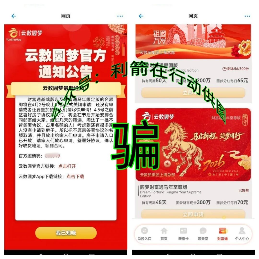 假冒官方,伪造红头文件,谎称是“国家项目”的云数圆梦APP是“云数贸”诈骗项目,其中“云数财富通基础版”交305元,“云数财富通黄金版”交505元,“云数财富通铂金版”交705元,“云数财富通钻石版”交1005元,“云数财富通爱国版”交1605元,“云数财富通马年至尊版”交2026元都是通过来路不明的账户收款,因此是诈骗洗钱的杀猪盘。