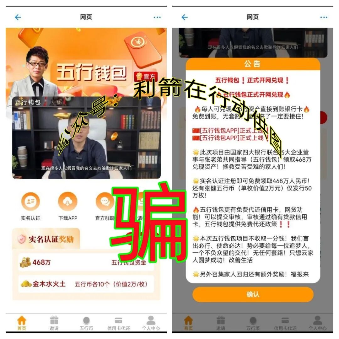 五行钱包APP是民族资产解冻类诈骗项目,谎称要给参与者468万元兑现资产,还要送价值1000万元的五行币,这些都是“利诱”参与者上钩的“诱饵”,目前正在疯狂诈骗,赶紧远离。