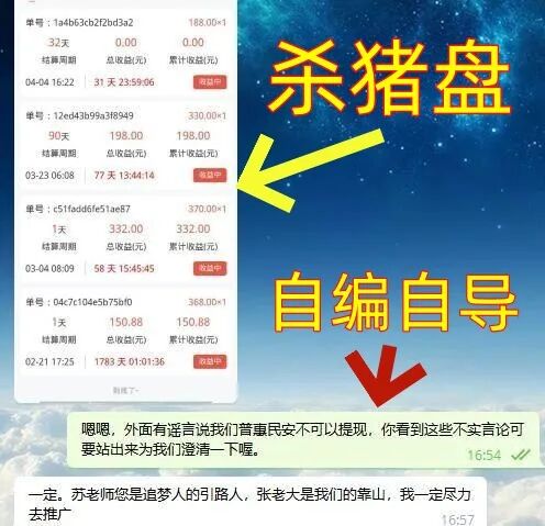 普惠民安APP中的理财项目是诈骗洗钱的杀猪盘,前期都会兑现(“养猪”),后期就会不兑现(“杀猪”),骗子们自编自导的对话是忽悠不明真相的人上钩的。