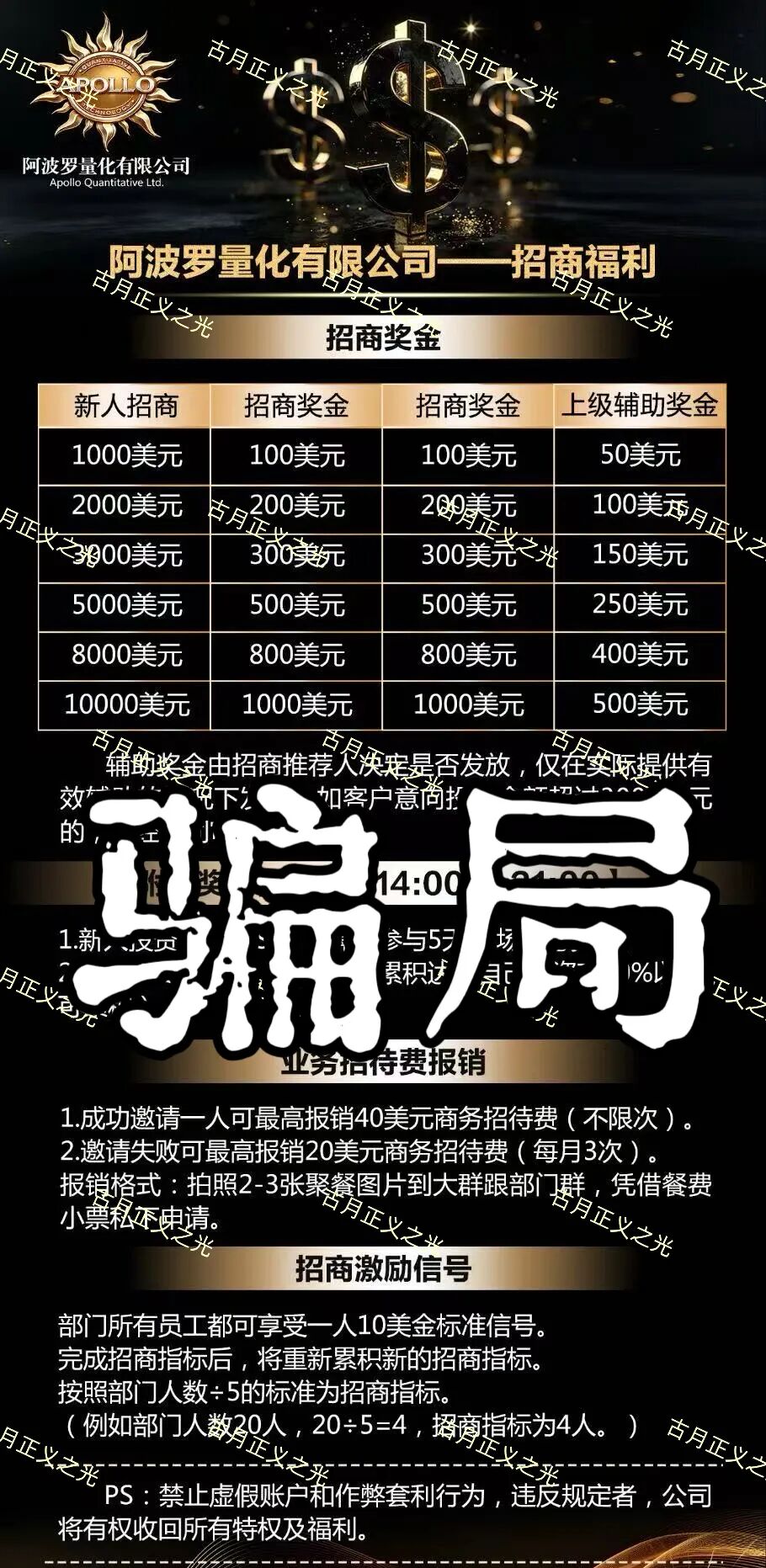 指出真相的人,会变成傻子和骗子的共同敌人,大家好,我是古月,对于“聚散成庄”只不过是项目方玩的噱头,但柬埔寨园区的这些骗子就能通过这个不停的制作很多所谓交易所带单盘,少不了国内的黑心团队长的功劳,老韭菜现在割不动了,他们又开始搞各种噱头拉新韭菜去填坑,其实都是一丘之貉。小编今天换个角度来说这个阿波罗量化资金盘骗局,此盘操盘手自称刘德伟,是之前“煜某金融”的平移重启盘,开盘几个月了,套路就过过多解析了之前曝光过,最近此盘操盘手老刘单割后还放狠话威胁会员,要弄死受害者,现在此盘专割小白,让团队长们去地推拉身边人,这也是找死,崩盘跑路了不怕身边人报警找你?还在做的速度撤离,马上要崩盘跑路!
