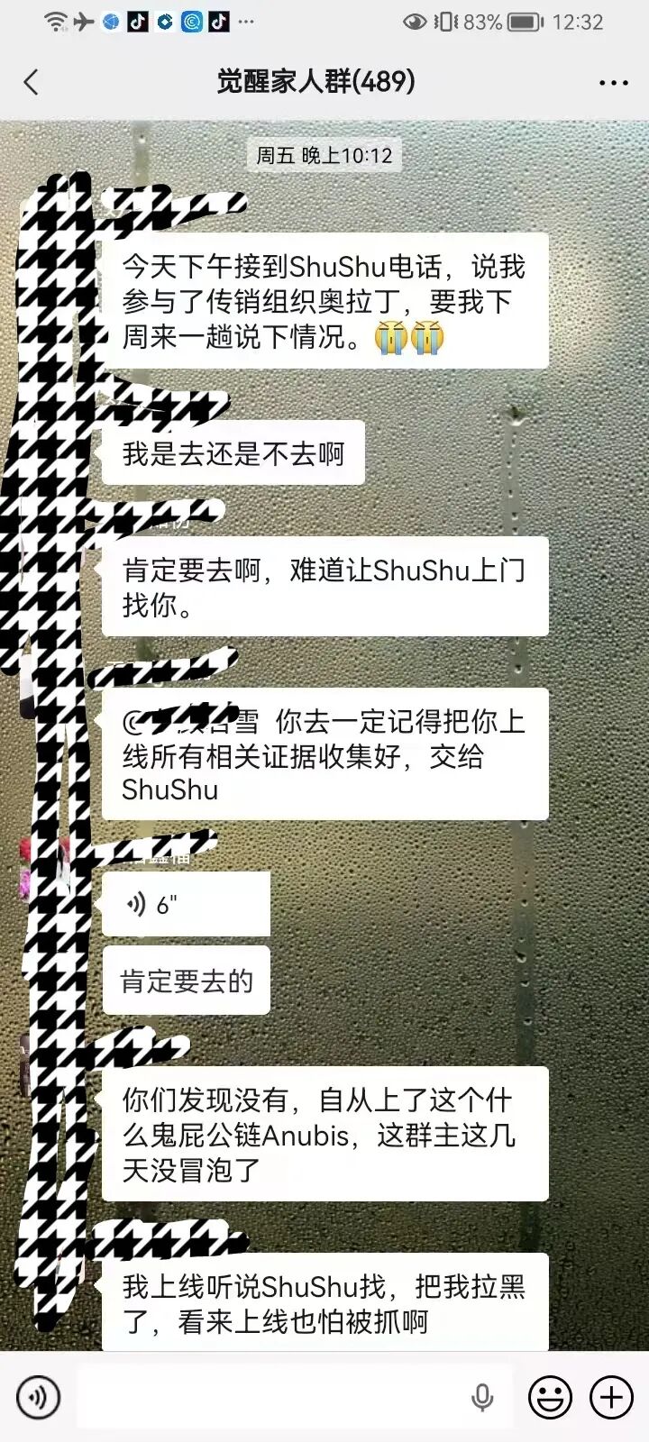 现在群里的气氛已经完全慌了,有人接到电话后不知所措,在群里问要不要去、会不会有事;也有人提醒,必须配合调查,不然更麻烦,还让大家赶紧保存好和上线的聊天、转账、拉人头的所有证据。