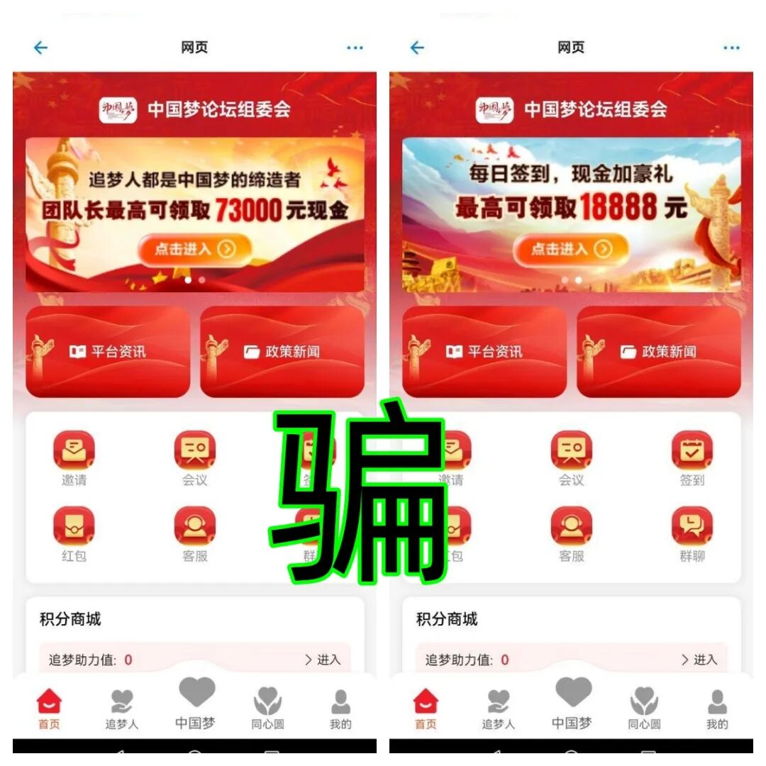 提醒:“中国梦论坛”APP是民族资产解冻类诈骗项目!按照同类型骗局套路,前期利用虚假的高额回报做“诱饵”骗取参与者入坑,骗取参与者身份信息,后期被骗人就会被要求交各种虚假的费用进行诈骗,请大家提高警惕,别被骗了。