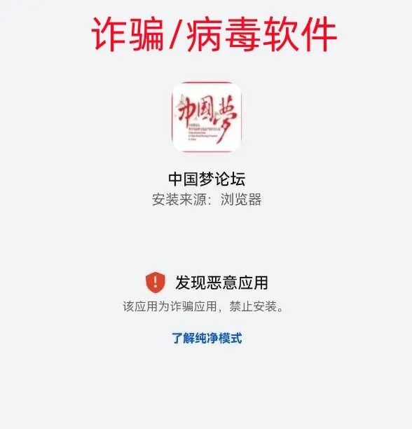 近期网络中出现了“中国梦论坛”APP,该项目网站搭建在境外,系非法软件,下载“中国梦论坛”APP的时候,显示是诈骗/病毒软件