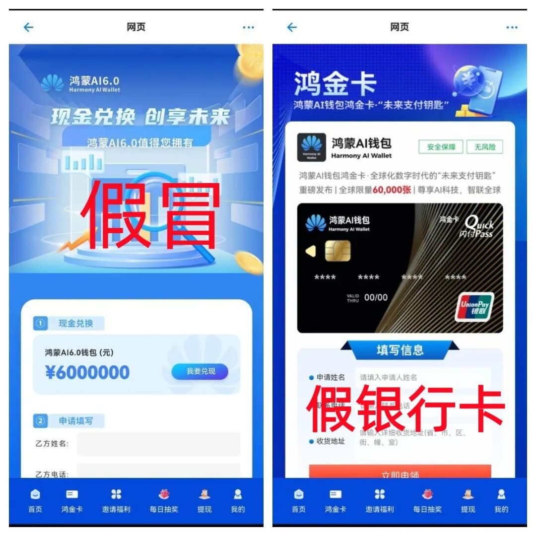 上线20多天,假冒的鸿蒙AI6.0APP网站IP地址在美国,系非法网站,编造电话号码就能注册,说明该APP太假,该项目宣传“实名认证注册就给600万元,还要给参与者办理鸿金卡...........”,这些都是诈骗道具,只要想拿到600万元,就会被精准诈骗,请大家提高警惕,别上当被骗。