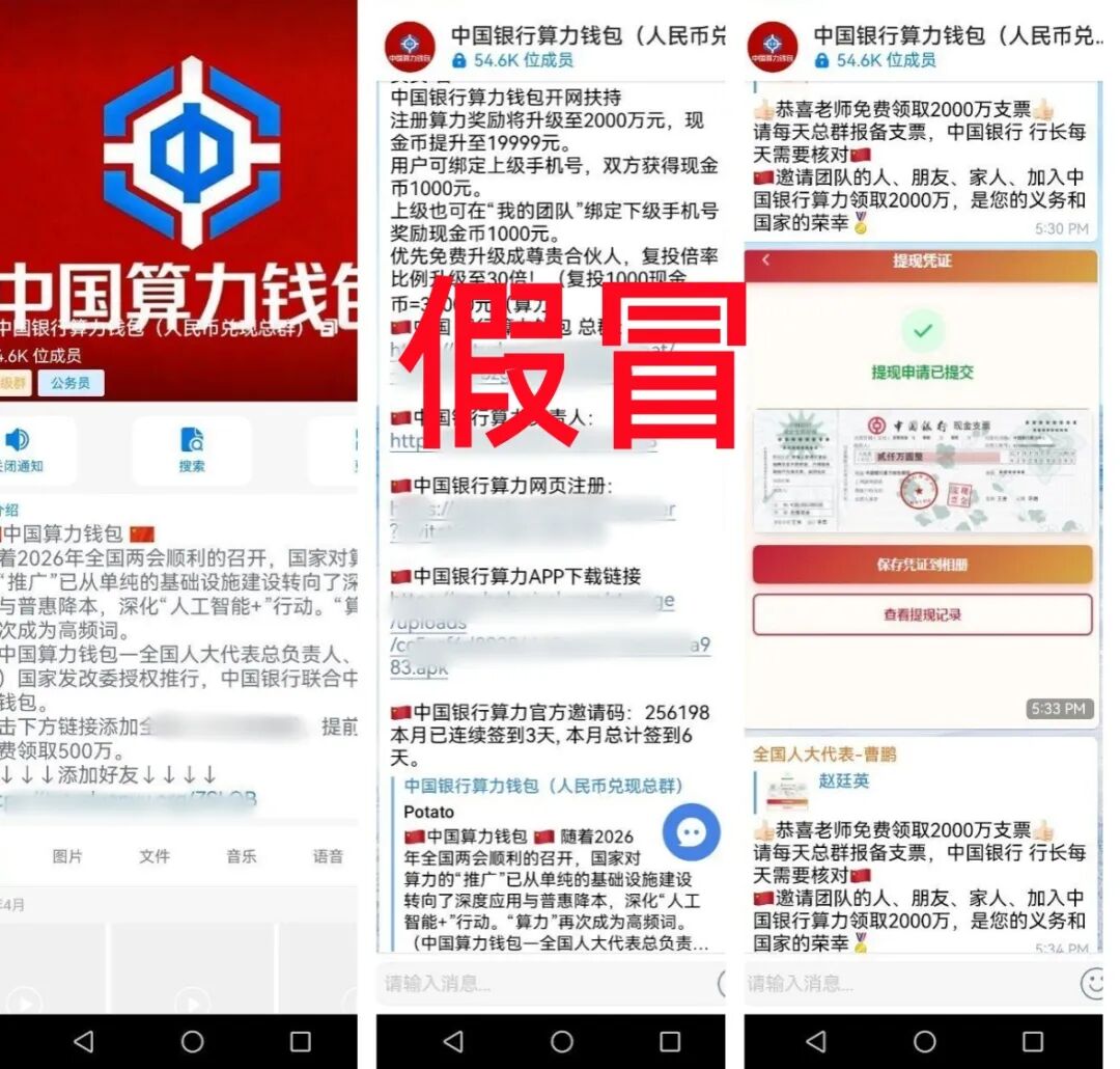 提醒:“中国银行算力钱包”APP是民族资产解冻类诈骗项目,前期利用虚假的高额回报做诱饵,骗成千上万人入坑,后期参与者要兑现的时候,就会被要求交各种虚假的费用进行诈骗,请大家提高警惕,别中了骗子的圈套,识破这个骗局很简单,到任意一家中国银行咨询核实,或者打中国银行客服电话了解有没有这个“算力钱包”,就知道是骗局了。