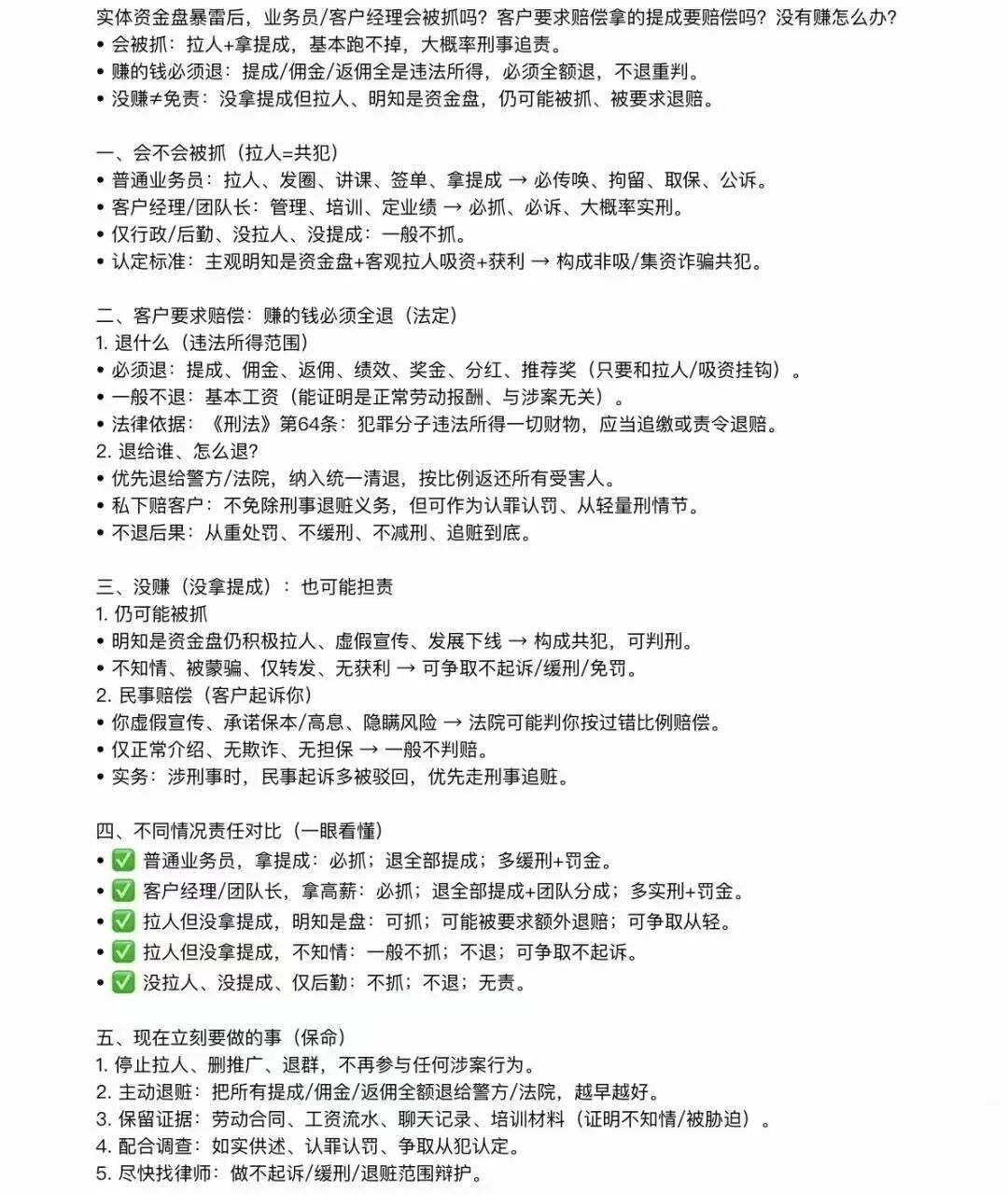 实体资金盘暴雷后,团队长,业务员等会被抓吗?客户要赔偿拿的提成赔偿吗?没有赚怎么办?